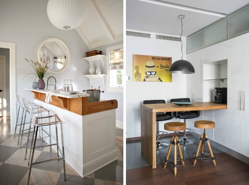 Полезный совет! С целью экономии кухонного пространства вместо традиционных барных стульев можно приобрести высокие табуреты из пластика. При необходимости их можно компактно, один в один, разместить под стойкой. Очень красиво и изысканно на маленькой кухне будут смотреться прозрачные пластиковые стулья.