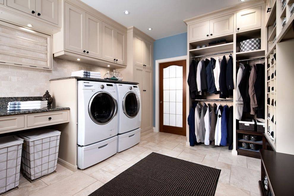 - Наступает черед розеток. В гардеробном помещении они встречаются нечасто. Поэтому их необходимо сделать возле стиральной машинки. Если в комнате имеется старая розетка, ее лучше заменить. Для стабильной работы техники необходима достаточная мощность. Старые розетки ее обеспечить не смогут. Это приведет к поломке техники или воспламенению. Стоит отметить, что подсоединять технику к сети при помощи удлинителей запрещено. Лучше всего обеспечить прямой доступ к сети.