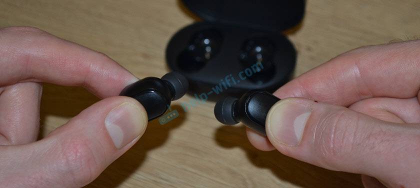 На Bluetooth TWS наушниках (когда два наушника отдельно, не соединены кабелем) нужно сделать сброс настроек. Об этом я подробно писал в статье как сбросить и синхронизировать беспроводные наушники между собой. Обычно для этого нужно зажать кнопки на обеих наушниках на 20-40 секунд.