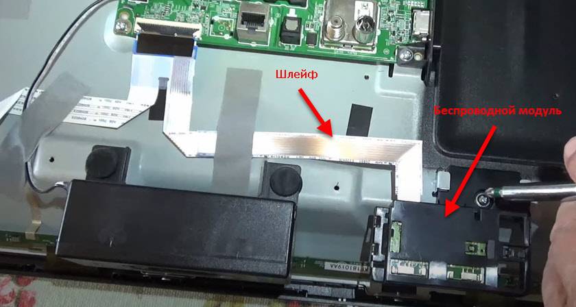- Пошевелить шлейф (который идет от платы к Wi-Fi модулю), собрать телевизор, включить его и возможно Wi-Fi заработает.