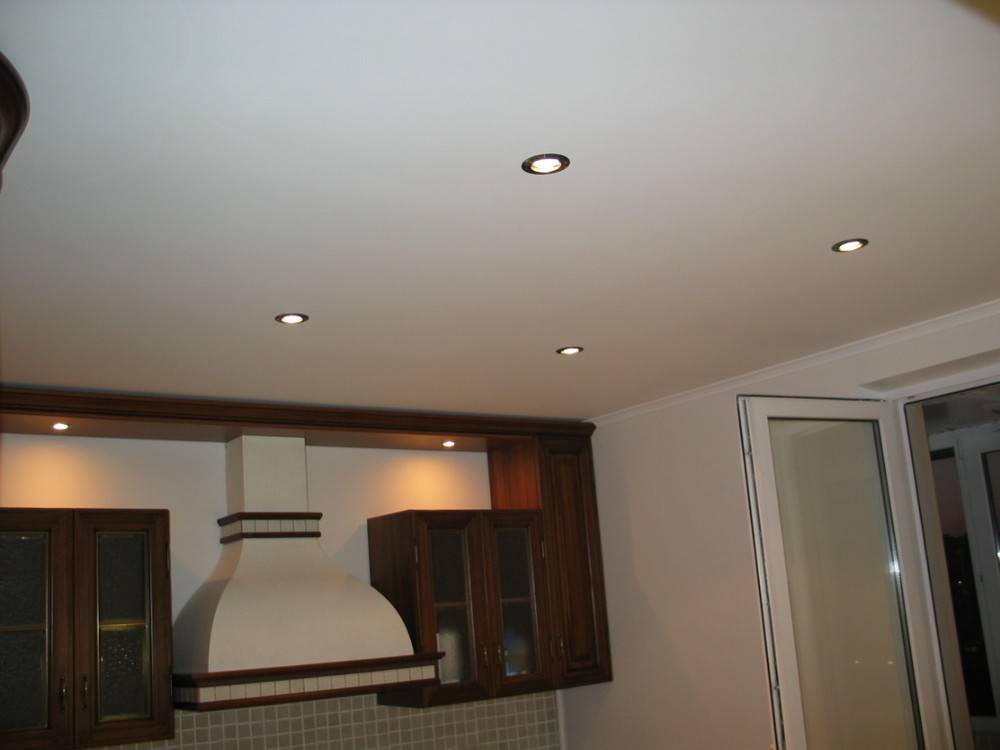 Продолжая отмечать минусы, следует упомянуть и тщательный выбор светильников на натяжной потолок. В случае монтажа покрытия придется выбирать светильники небольшой мощности, иначе, вокруг установленных приборов освещения могут образоваться неприятные желтые пятна. Плафон необходимо подобрать с хорошей термоизоляцией и правильно установить, для того, чтобы он не соприкасался с покрытием.