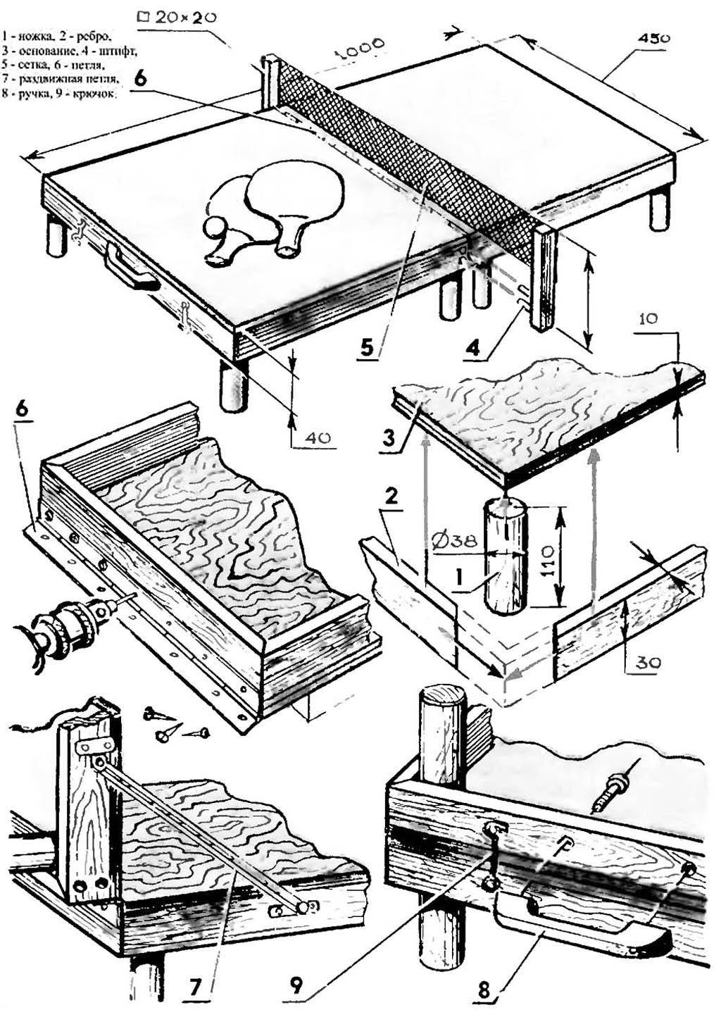 Что ж, и здесь можно выйти из положения, сделав детский теннисный столик своими руками, см. рис. Конструкция простейшая, даже покупная сетка не нужна. Ставить сей спортивный снаряд можно на обычный стол, на табуретки, детский столик и вообще на любую подставку. Или просто на пол. Встречаются такие плоды совместных усилий родителей, что сам еще чуть больше ракетки, а уже, пыхтя, кидает.