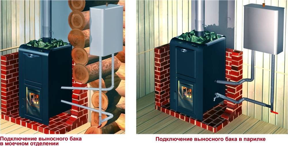 В корпус печи встроен теплообменник в виде бака, заполненного водой. Образцовое устройство обеспечивает постепенный нагрев жидкости, не доводя ее до кипения. Только при очень длительном использовании печи вода может стать кипятком. Благодаря выносной конструкции топку можно размещать в смежном с парной помещении, таким образом, в парной постоянно будет поддерживаться тепло и порядок.
