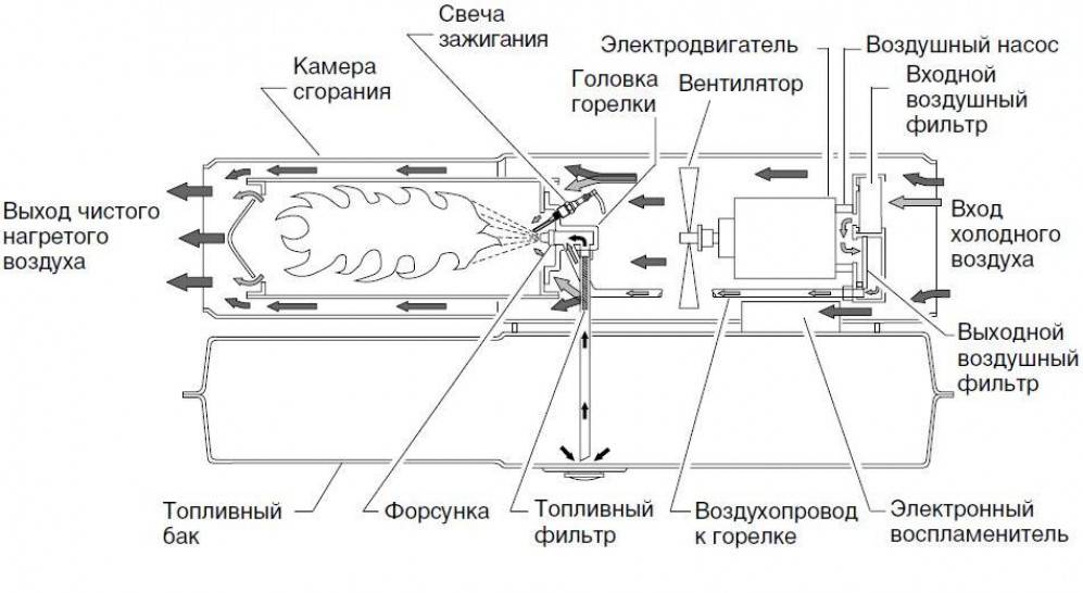 Работает любой подобный агрегат на очень простом принципе. Топливо, сгорая, отдает свою тепловую энергию, проходящему через теплообменник воздуху.