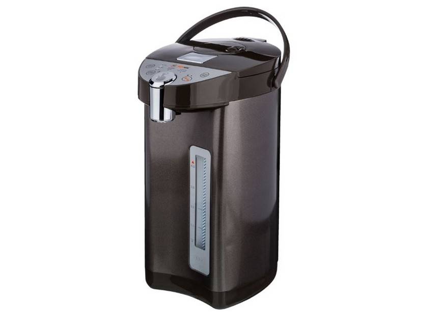 Ещё один 5-литровый чайник с небольшой мощностью – 800 Вт. Есть функция переключения трёх температурных режимов, а также дехлорирование воды для подачи чистой и полезной жидкости. Минус — высокая цена, так как термопот с такими же функциями можно купить за меньшие деньги.