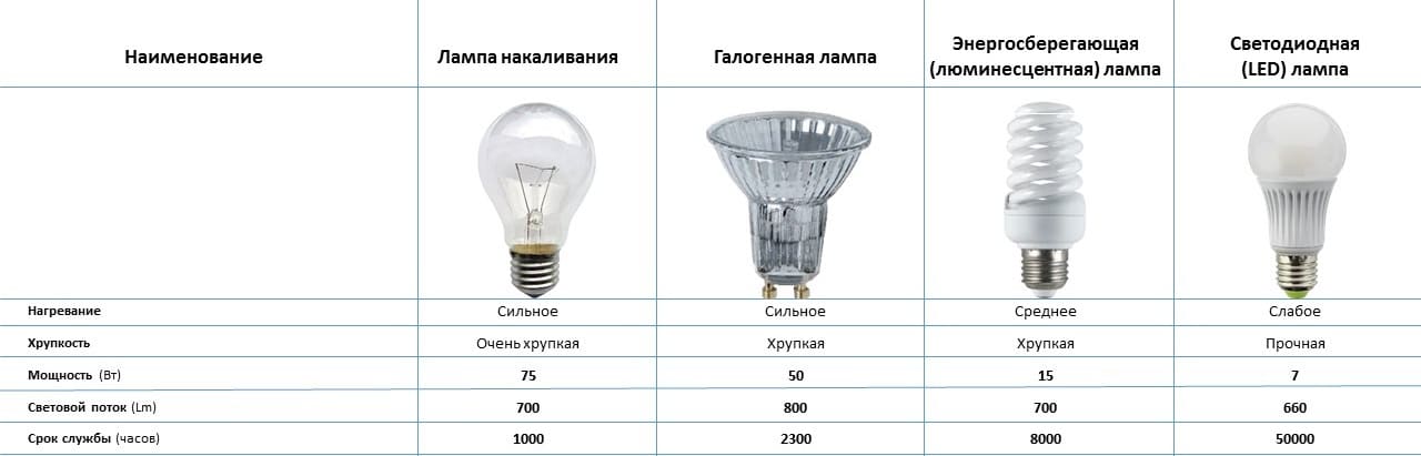 Сравнительная таблица лампочек накаливания, ЭСЛ и LED