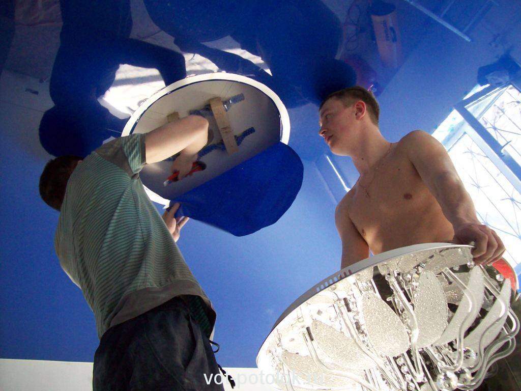 - Установка освещения. Под натяжным потолком нащупываем центр закладных и аккуратно вырезаются отверстия. Монтируются светильники и люстра.