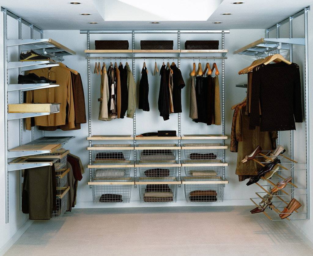 Модульные шкафы редко снабжены стандартными полками. Вместо них установлены сетки из металла. Также внутри систем размещаются корзины, подставки под обувь и головные уборы, штанги.
