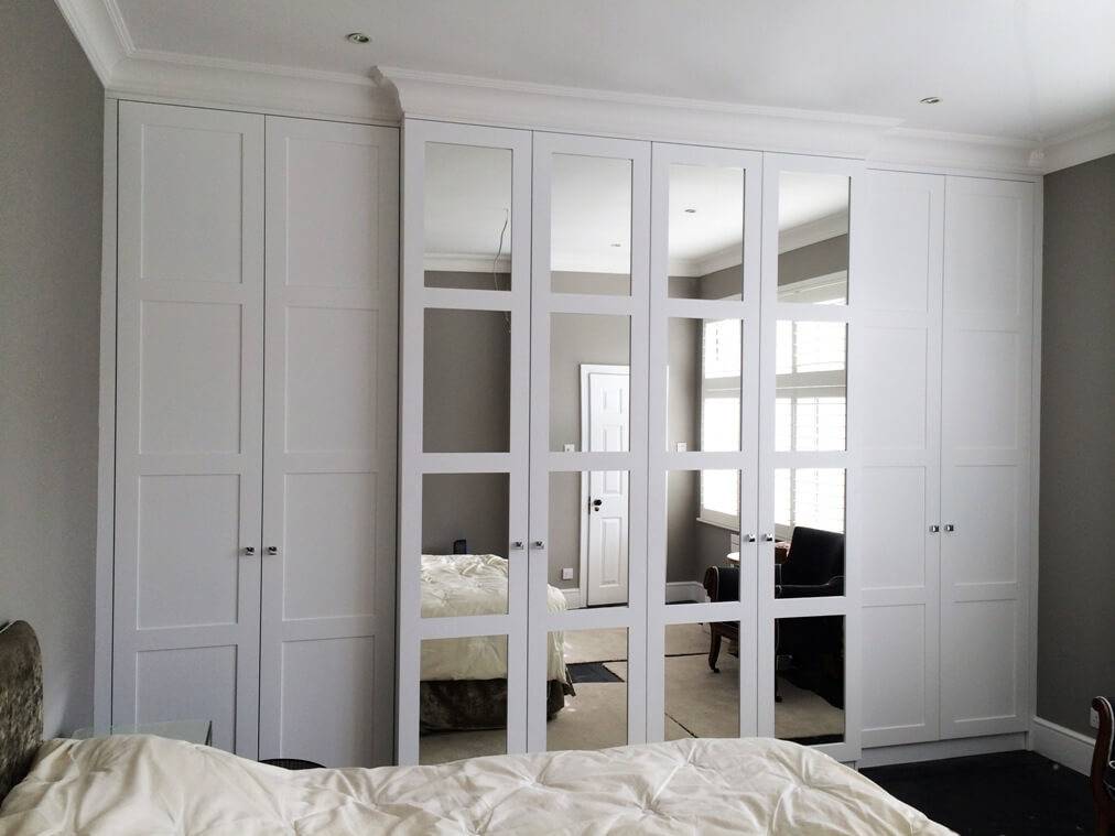 Комбинированный вариант имеет 3–5 створок. Внутреннее наполнение следующее: штанга для вешалок, антресоль, может быть с ящиками. Подходит для хранения одежды, обуви. Фасад обычно украшен большим зеркалом.