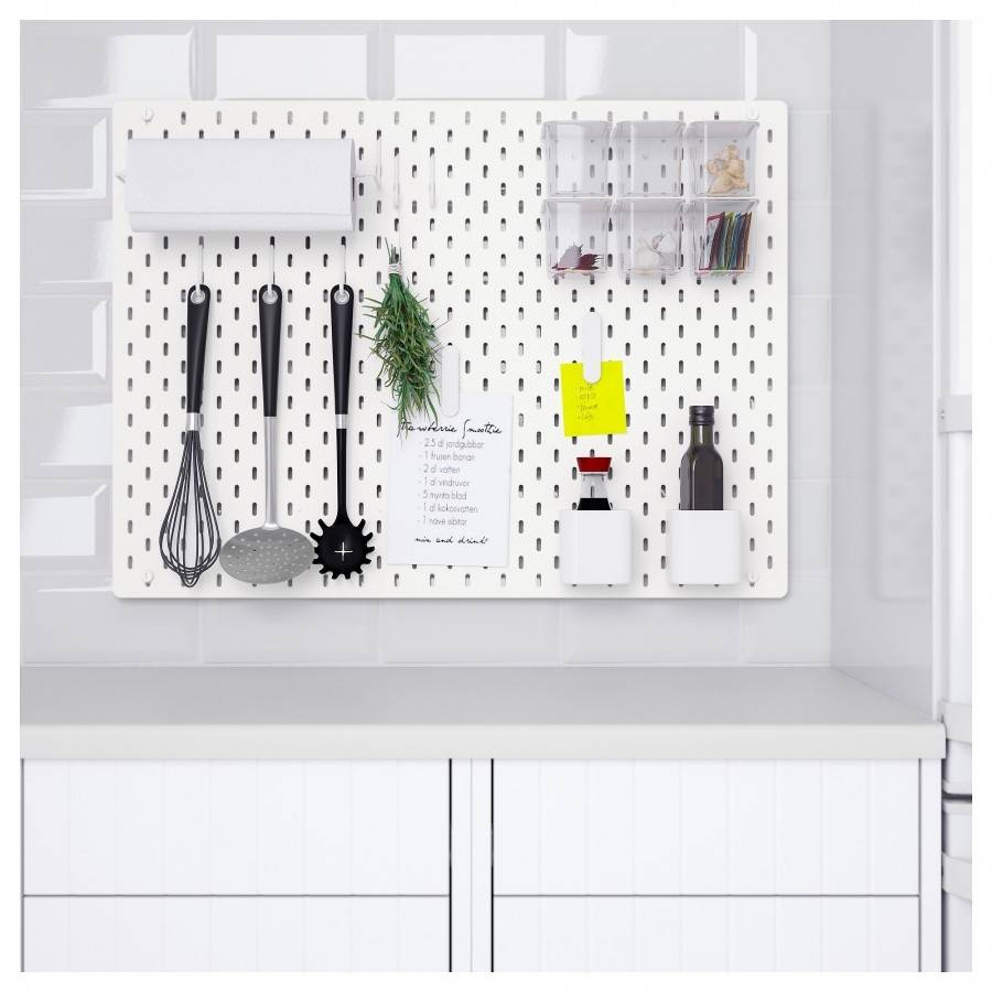 Такая настенная панель не помешает и на просторной кухне. С ее помощью все необходимые предметы на кухне будут на виду. На крючках отлично разместятся полотенца, прихватки и кухонная утварь. В прозрачных емкостях найдется место для специй. В подставке поместится бутылочки с маслом или уксусом.