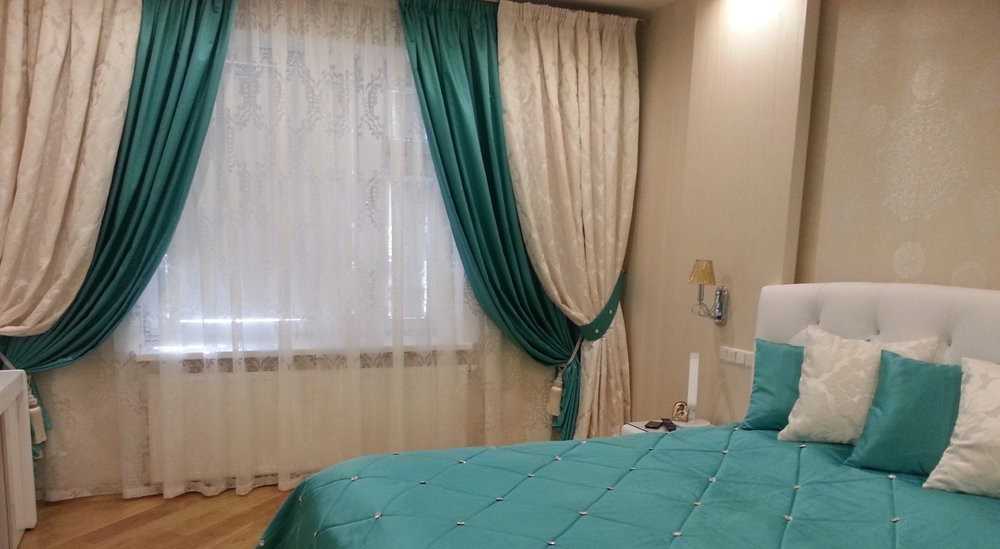 Обратите внимание на мятные, ярко-бирюзовые, коралловые оттенки ткани, они заставят интерьер заиграть другими красками. Если оформление обстановки спальни выдержано в спокойных тонах, то на окна лучше подобрать ткань яркого, насыщенного цвета