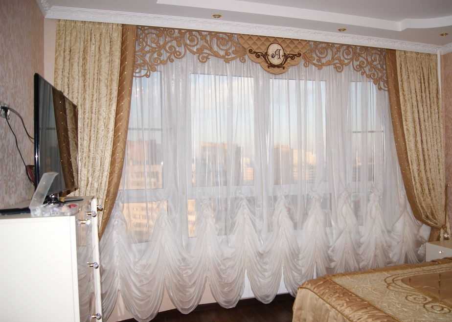 - обычная комбинация гардины с красивым ламбрекеном, но карниз вынесен вперед настолько, чтобы дверь свободно открывалась, это решение для просторной спальни с кроватью, удаленной от окна;