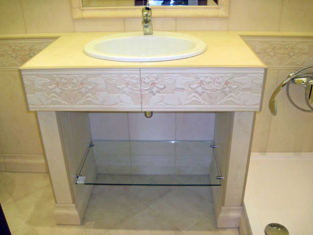 Стеклянные тумбы для раковин встречаются довольно редко, и, как правило, конструкция представляет собой раковину из прочного закалённого стекла, монтируемую на шкаф, изготовленный из того же материала. Многие беспокоятся о безопасности использования таких изделий, но это только кажущаяся хрупкость. Стенки и полки тумбы делаются из высокопрочного закалённого стекла приличной толщины − до 15 мм.
