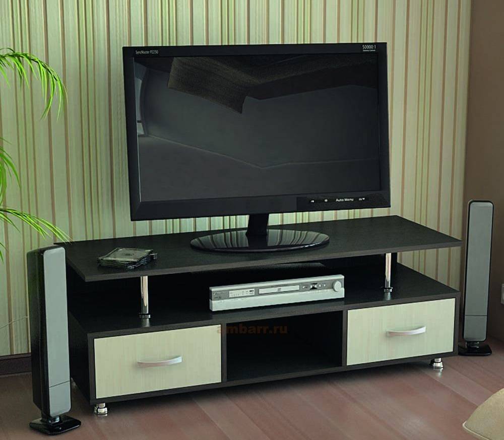 Открытая конструкция | Тумбы открытого типа, устанавливающиеся под телевизор, не оснащаются дверцами. Более того, у них отсутствуют также: задние панели (стенки); фасады. Такая мебель просто представляет собой каркас, оснащенный декоративными элементами. Конечно, внутри такой конструкции будет оседать больше пыли, однако, при этом она будет способствовать благоприятному пространственному ощущению и рациональному использованию свободного места комнаты. |