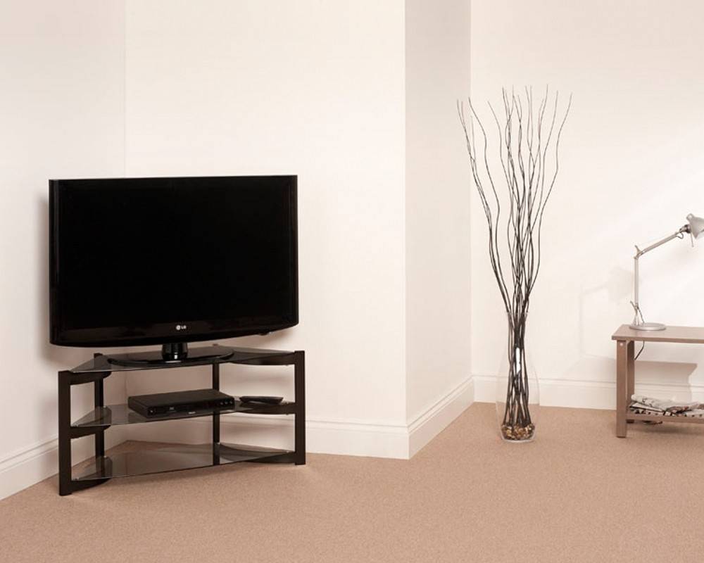 - Угловая — один из функциональных вариантов для небольших квартир или тех комнат, где телевизор не играет главенствующую роль, к примеру спален. За счет угловой конфигурации такой шкафчик занимает мало места, но при этом его полки или ящики обладают достаточным объемом и могут использоваться, к примеру, вместо комода для белья или книжной этажерки. А внешний вид угловых тумбочек и полок всегда придает помещению дополнительный уют.