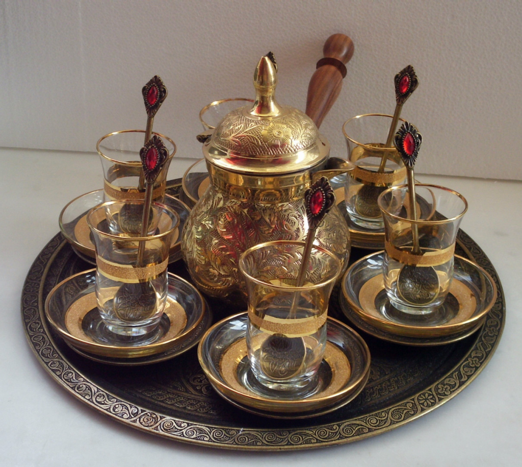 Для обеспеченных людей предлагаются роскошные модели из настоящего золота или серебра. Отличной альтернативой стеклу является хрусталь с красивыми узорами. Объём стаканов совсем небольшой – 100 мл, этого вполне достаточно, чтобы успеть выпить напиток во время разговоров, а потом долить ещё. Порой за одну чайную церемонии турки могут распить 15 порций горячего чая.
