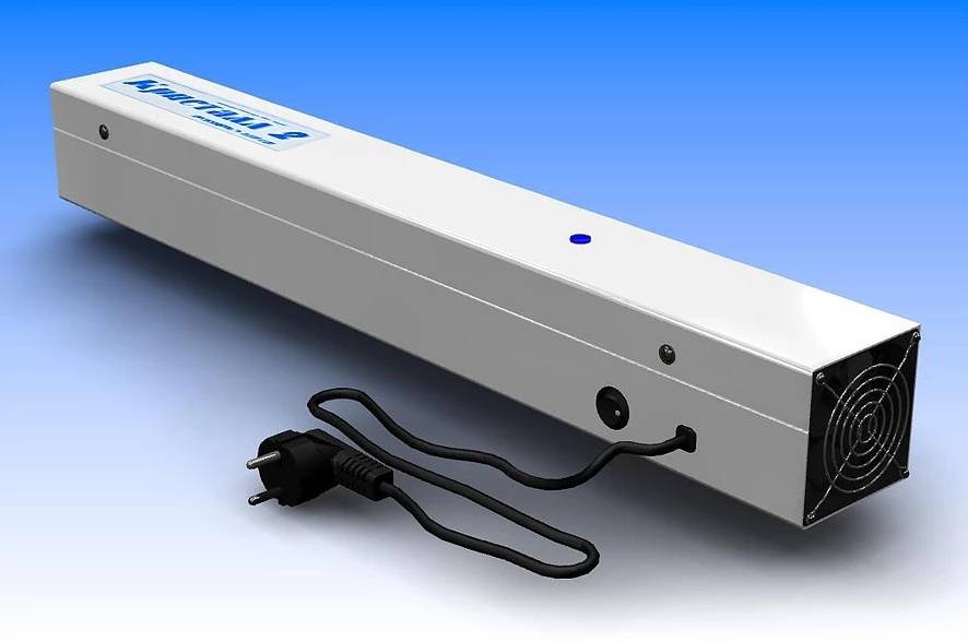 Это облучатель закрытого типа, оснащается двумя бактерицидными лампами по 11 Вт, может быть закреплен на стене. Производительность – 60 м3/час. Ресурс работы лампы – 6 000 часов. Потом лампу типа PL-S Phillips надо будет заменить – расходники есть в свободной продаже. Отличное устройство за свои деньги, стоит 14 000 рублей.