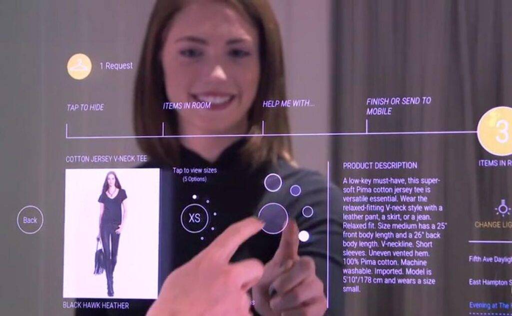 - Connected Fitting Room – это система, аналогичной зеркалу Mirror от компании Accenture. Однако у нее есть несколько существенных различий. Прежде всего, это высокотехнологичное зеркало не только считывает чип на этикетке товара и выдает о нем всю информацию, но и позволяет с помощью интерактивного экрана поддерживать связь с продавцом. Клиент может попросить сотрудника магазина принести обувь или одежду другого размера, цвета либо что-то из рекомендованного системой списка сопутствующих товаров не выходя из примерочной.