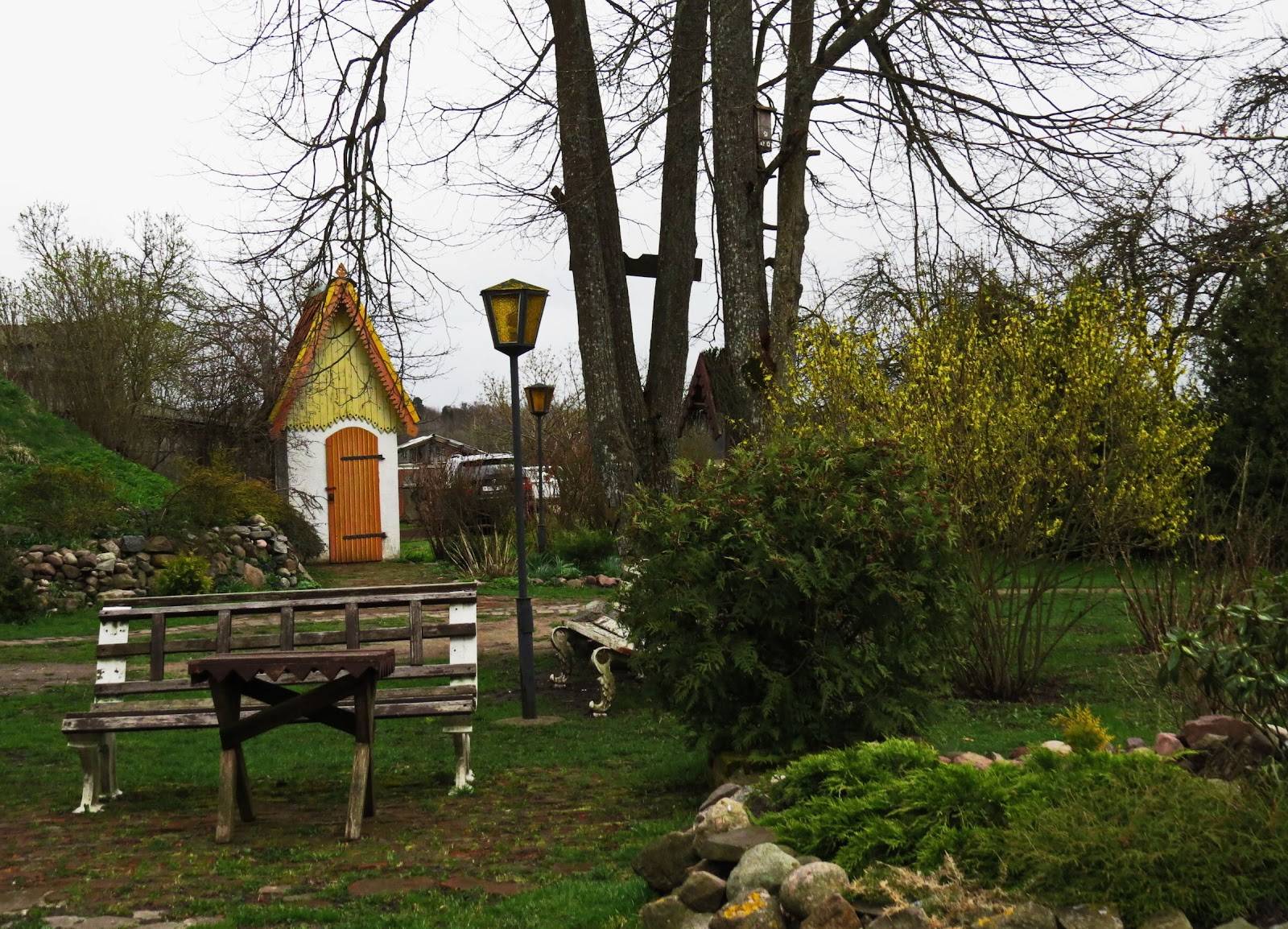 Экскурсию проводит Инесса Савельевна, начиная ее с показа облагороженной школьной территории. Здесь действительно очень красиво и уютно. Можно полюбоваться аккуратным зеленым газоном, декоративными растениями, красивыми постройками в немецком стиле. При работах по обустройству участка было найдено много исторических артефактов.