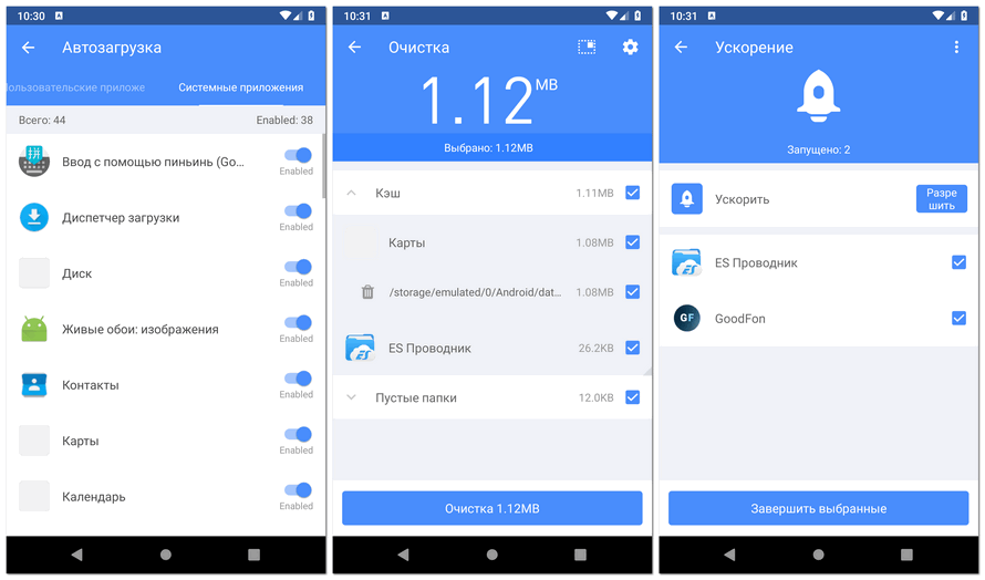 Все три приложения похожи друг на друга и имеют одинаковый функционал. С помощью них можно не только удалить ненужные файлы, но и остановить ненужные процессы, а также просканировать устройство на наличие вредоносного ПО.