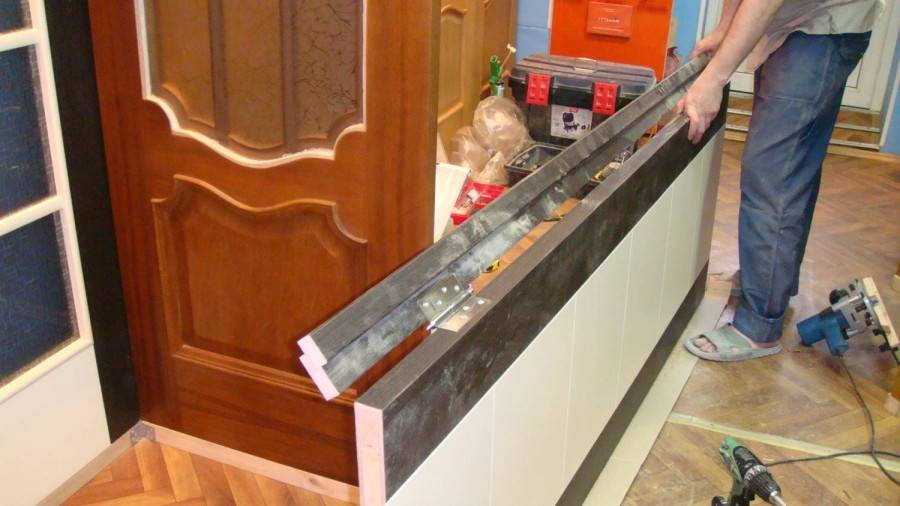 Для П-образной коробки между полом и полотном должен оставаться зазор в 1 см. Детали коробки соединяют саморезами (не менее 2 шт на стык, длиной более 6 см).