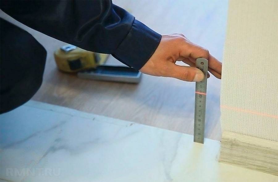 4. Отмечаем высоту петельного и притворного брусов. Как узнать требуемую высоту я рассказал немного выше. Это высота дверного полотна + верхний зазор 3 мм + нижний зазор. Если полы ровные, то достаточно 10 мм. При открытии дверное полотно не должно цеплять или упираться в пол. Сильно высокий зазор не стоит делать — для нормальной циркуляции воздуха достаточно 10 — 15 мм. Если помещение влажное, то допускаются большие величины.