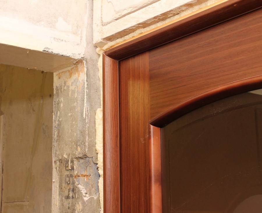 Бывают ситуации, когда коробка не может полностью закрыть косяк. Помогают скрыть проем декоративные доборы. Они закрепляются непосредственно к косяку или крепятся к коробке перед монтажом. Выберите правильный размер доборов или отрежьте их по месту. Закрепляют такие доборы в паз с помощью пены.