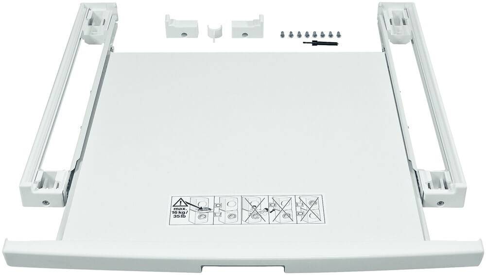 Поскольку установка агрегатов в колонну пользуется большой популярностью, обычно производители предлагают специальные полки для закрепления сушильной машины над стиральной. Выглядит такое приспособление, как плоская доска из прочного пластика, а используют ее следующим образом: