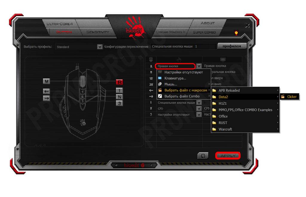 Переходим во вкладку “Button”, выбираем наш макрос в меню правой кнопки мыши и загружаем макрос в мышь нажатием кнопки “APPLY”