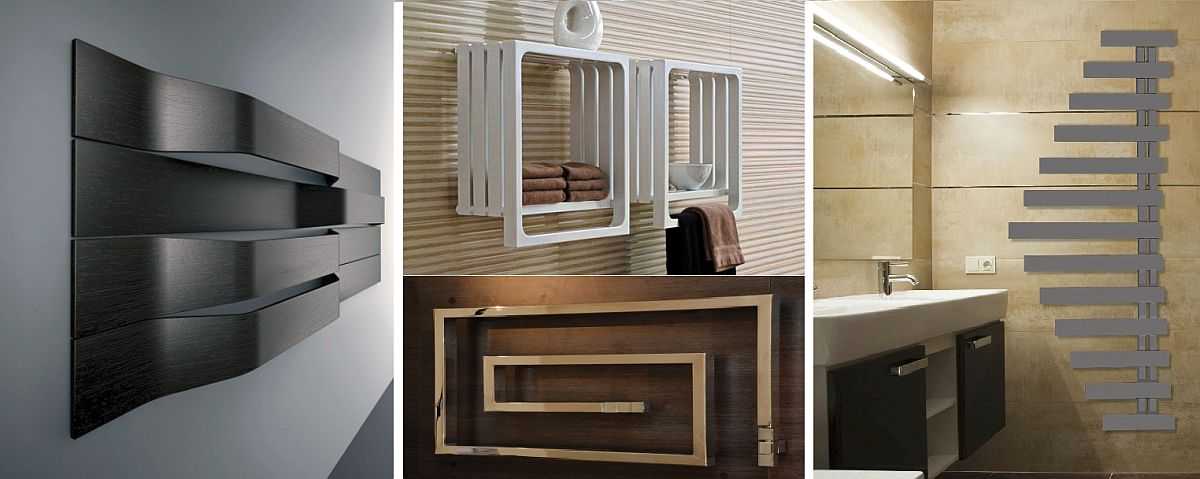 Приборы имеют различную форму — U-, П-, М-, С-образную, «лесенка», «трапеция», угловую, ступенчатую, в виде кольца, «змейки». Могут быть поворотными, с дополнительной полкой. Покрытие — из блестящего хрома, термоустойчивых красок, под состаренную латунь или бронзу. Разнообразие форм и цветов позволяет использовать конструкцию в любом интерьере ванной комнаты.