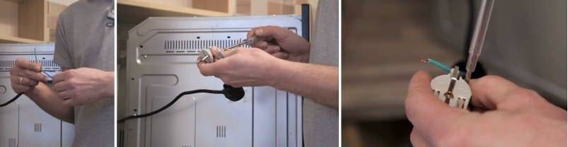 - Когда все соединения выполнены правильно, встраиваемую духовку ставят в нужную нишу, и затем фиксируют с помощью шурупов.