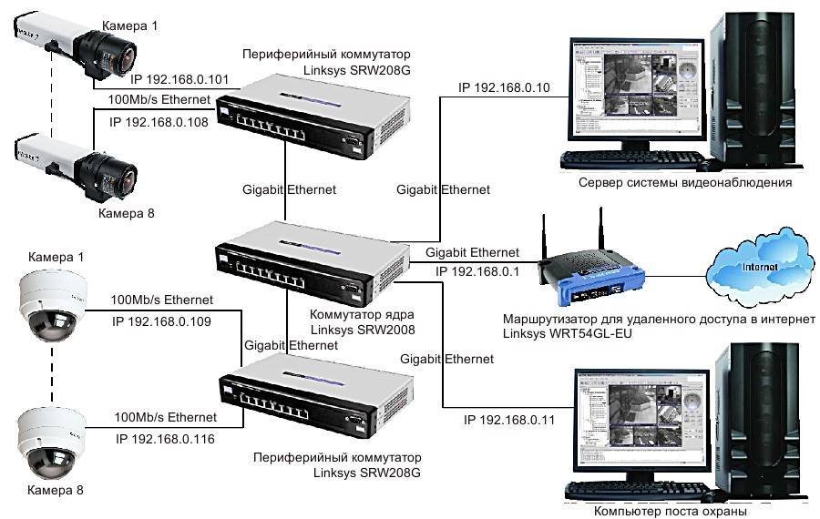 Для связи между компонентами используется витая пара. В видеорегистраторе находится приемник, а в камере передатчик видео. Такое решение дает создать высококачественное видеонаблюдение. Сетевой коммутатор предоставляет подсоединение большего числа камер. Сетевой видеорегистратор необходим для записи, отображения и хранения записанного материала. Через интернет реализуется доступ к IP видеонаблюдению. С помощью модема или Ethernet-кабеля коммутатор соединяется с маршрутизатором, который имеет доступ в интернет. Удаленный доступ к камерам и регистраторам создается после осуществления настроек.