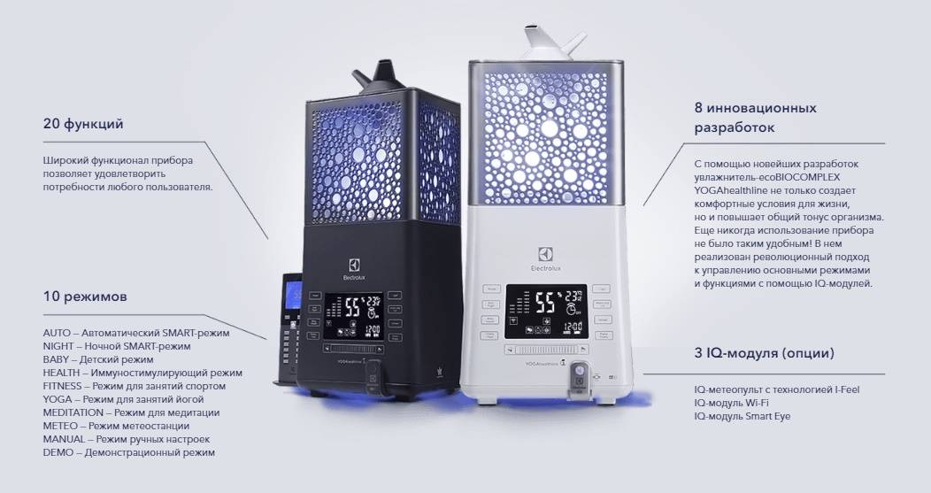 Всем известно, что увлажнители Electrolux нового поколения имеют возможность обрабатывать помещение самыми разными функциями, а именно иметь встроенную систему очистки, обеззараживания и кондиционирования. Однако, это не все «навороты», которыми оснащаются ультразвуковые устройства. Обо всём подробнее в этом разделе.
