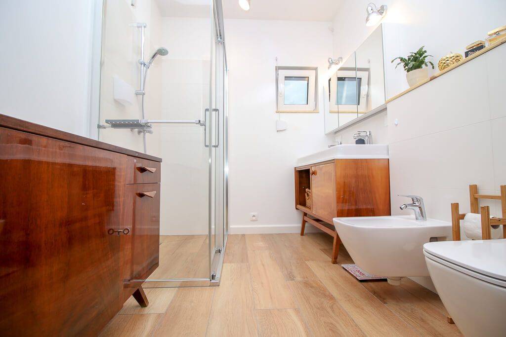 Установка душевой кабины может быть немного сложнее , особенно если вы хотите сделать это в рамках ремонта ванной комнаты. Здесь требуется вмешательство в пол в ванной — необходимо создать влагоизоляцию. На этом этапе также следует создать дренажную систему — линейный дренаж прямо в полу с большой площадью и отличной эффективностью, либо дренаж стен. Следующим шагом будет создание небольшого уклона пола в сторону водостока, чтобы вода не переливалась через душевую зону. Пол следует покрыть влагостойкой облицовкой — здесь хорошо подойдет стандартная плитка, но стоит иметь нескользящую поверхность. На таком подготовленном субстрате его можно проводить установку душевой кабины.