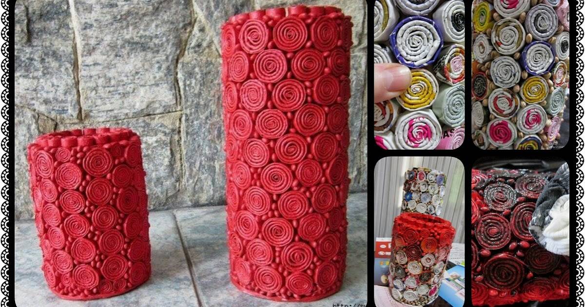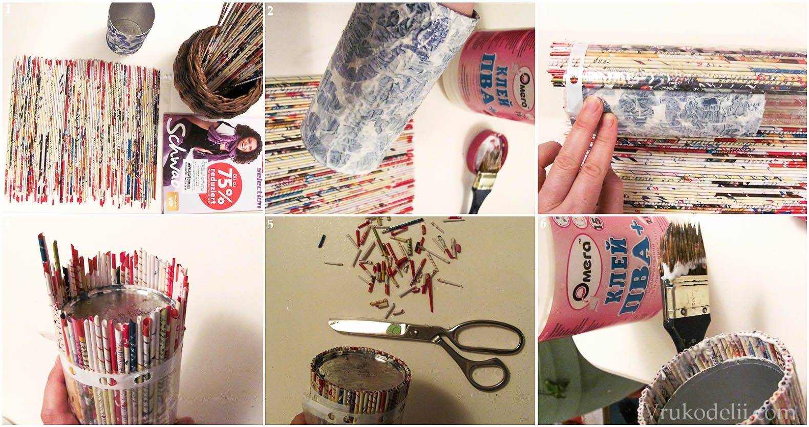 - Ваза из газетной лозы. Делаем газетные трубочки из старых газет, наматывая бумагу на тонкие спицы. Основой нашей вазы станет туба от бумажных полотенец, ее мы плотно обклеиваем трубочками. Для того чтобы придать вазе красивую форму, срезаем трубочки под углом и делаем плавный переход. Смешиваем лак для дерева с выбранным цветом краски и покрываем изделие. Декорируем вазу цветами из лент, тесьмой и бусинами.