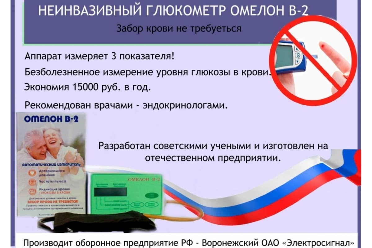 В производстве этих приборов применены новейшие разработки, позволяющие делать анализ без забора крови. Прибор Омелон В-2 разработан в России. В основе технологии — зависимость тонуса мышц и сосудов от уровня глюкозы. Аппарат несколько раз замеряет пульсовую волну, артериальное давление, сосудистый тонус. На основе результатов определяет уровень сахара.