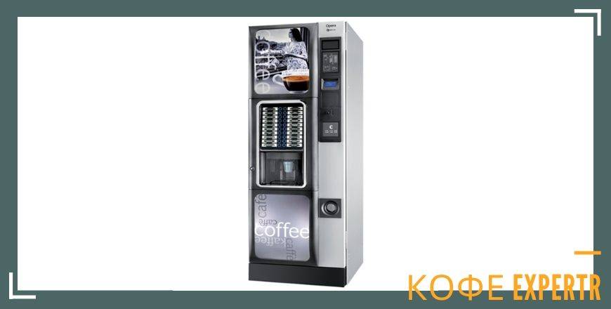 10. Opera To Go – кофемат итальянского бренда, отличается большим контейнером для зерен, а также отсеком для растворимого кофе. Кофейный аппарат выделяется стильным дизайном, есть 18 кнопок для приготовления разных напитков. Есть купюроприемник, но также предусмотрен безналичный расчет. Дверь укрепленная, замок усилен.