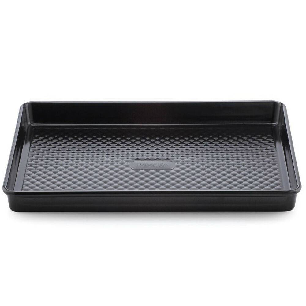 Противень прямоугольный со стороной в 40 см. Дно имеет интересную форму – с ребрами. Это позволяет готовить более здоровую еду, использовать минимум жиров и получать сочные, равномерно приготовленные блюда. Для удобства модель оснащена силиконовыми ручками. Они не нагреваются в процессе приготовления, поэтому противень в любой момент можно достать из духовки без каких-либо приспособлений. Основной недостаток этой посуды – высокая цена.