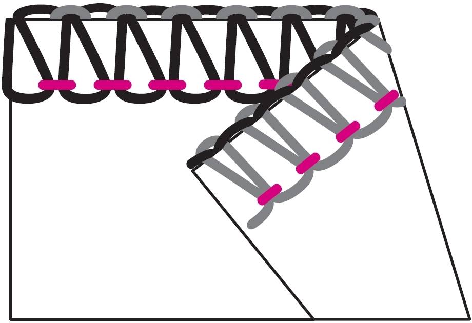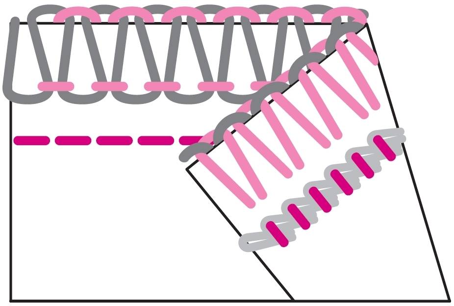 4-ниточный шов одновременно обрабатывает срез и пришивает один обрез к другому. В этом случае стачивающе-обметочный шов получается очень крепким.