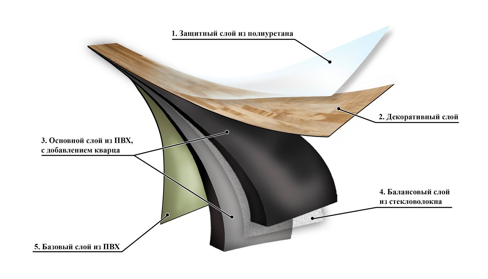 Третий и пятый слой, они же тело лимината, состоят из кварца (80%) и винила. Между ними четвертый слой из стекловолокна, выполняющий роль армирующего элемента. Завершает бутерброд еще один слой их поливинилхлорида, который служит основанием для виниловой панели.
