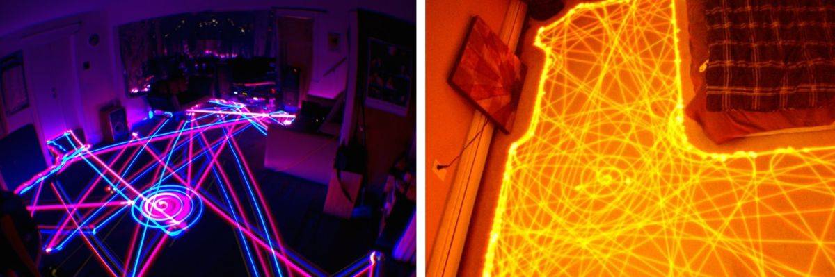 Для таких фотографий есть отдельное название — «Roomba art». К роботу-пылесосу прикрепляется светодиод, а затем его движение по комнате снимается с долгой выдержкой. Снимки объединяются, пылесос убирается из кадра, и получаются фантастические узоры.