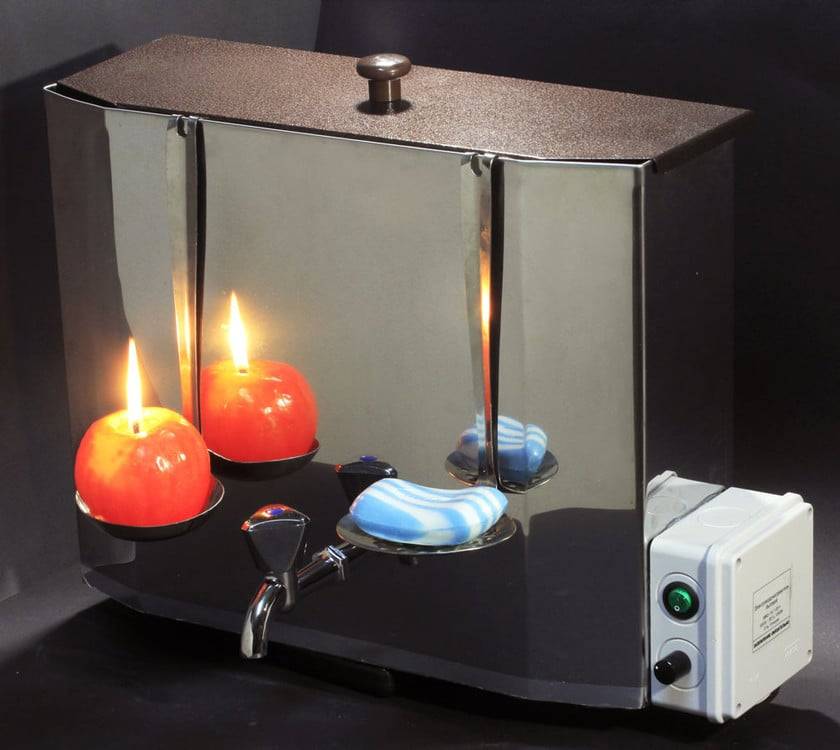 По типу наливных сделан кипятильник и самый малообъемный из последовательности электрических бойлеров вычислен на 5л. Он похож на шкафчик с краном, на передней панели которого находятся регуляторы тёплой/холодной воды.