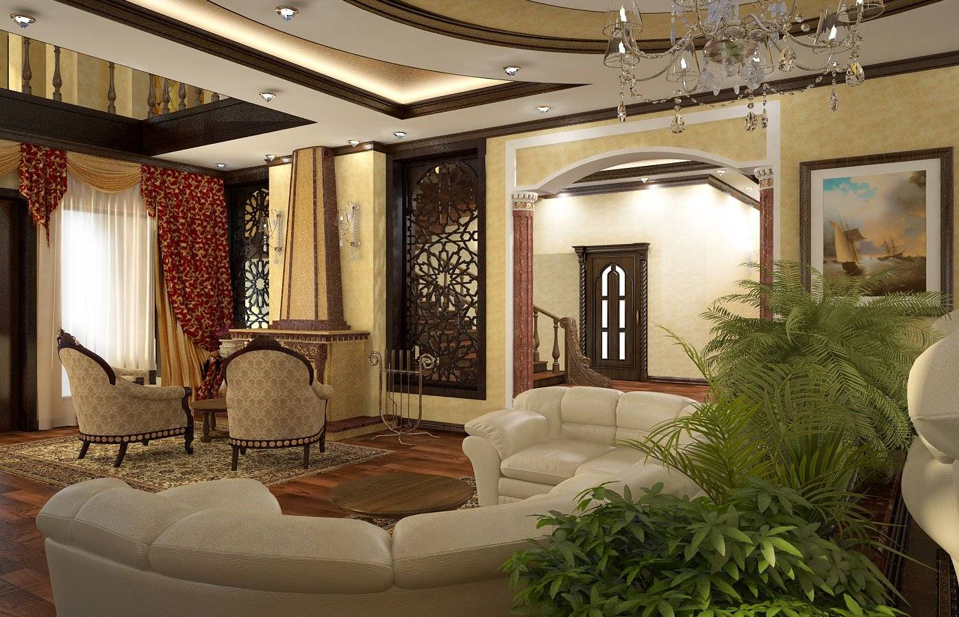 - Воссоздание колорита возможно в комнатах с высокими потолками, украшенными узорчатыми рисунками или сводами, напоминающими паруса.