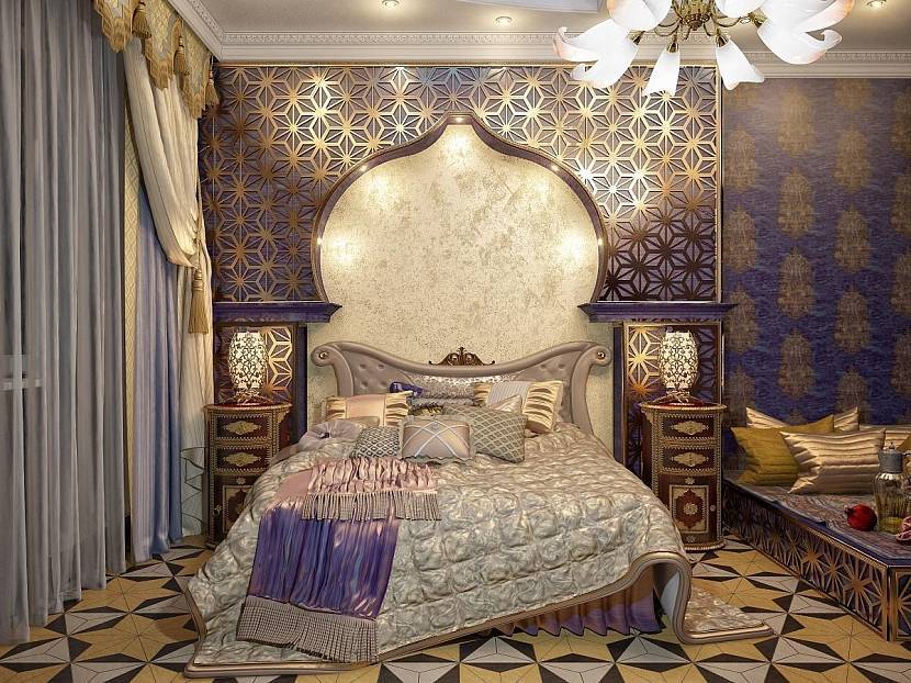 Спальня в арабском стиле наполнена богатством, в центре помещения находится большая кровать, её можно дополнить балдахинами, подушками, покрывалом. Деревянное изголовье, резные детали, инкрустация, арки, ковры. В таком помещении нет места телевизионной технике, здесь нужно отдыхать, расслабляться и набираться сил.