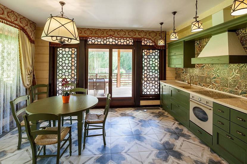 На первом месте в интерьере кухни в восточном стиле находится функциональность. Для того чтобы частично наполнить интерьер восточными нотками входную дверь можно украсить аркой, а для отделки кухонного фартука использовать мозаику. Необычные аксессуары, посуда, кухонные принадлежности помогут подчеркнуть изысканность и утонченность стиля.