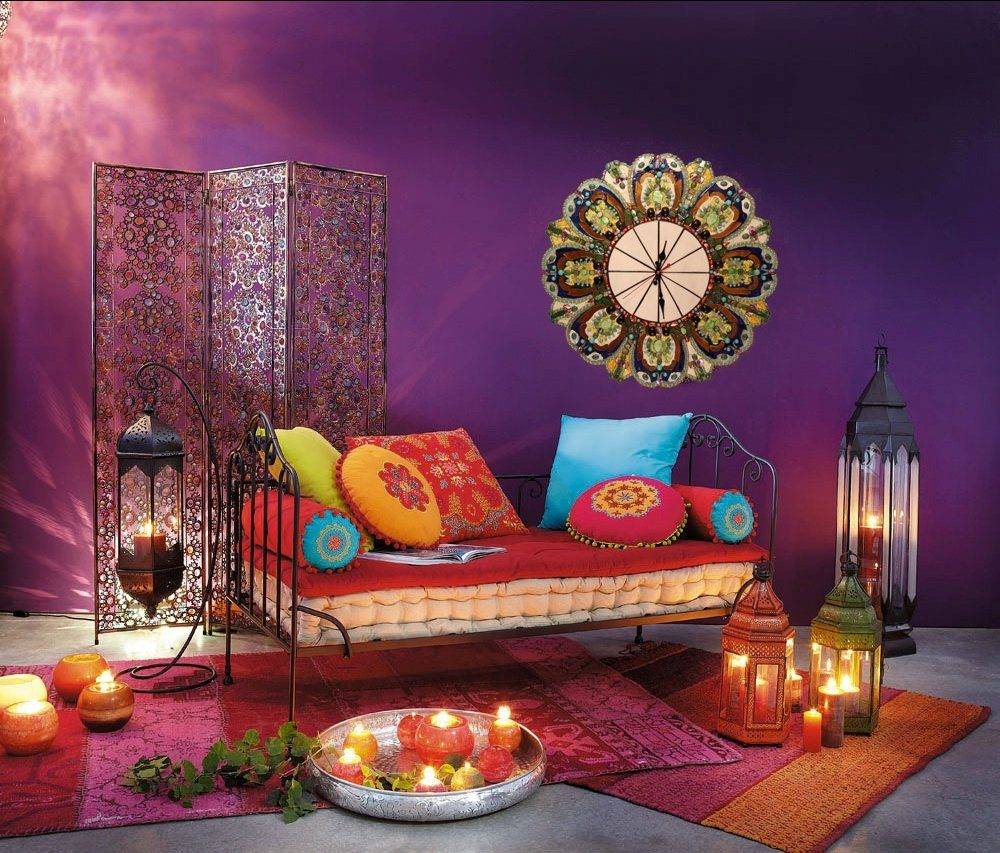 Обилие текстиля и использование оттенков яркой цветовой гаммы делает интерьер наполненным, к выбору мебели нужно подходить очень осторожно, один лишний комод или неудачное место для дивана может нарушить гармонию.