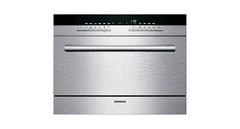 Одним из лидеров среди компактных встраиваемых посудомоек считается агрегат от торговой марки «Сименс». Модель частично встраиваемая и выглядит достаточно привлекательно и современно. Дисплей и кнопки управления расположены на передней панели, сама посудомойка имеет стильный серебристый корпус и отлично вписывается в любую кухню.