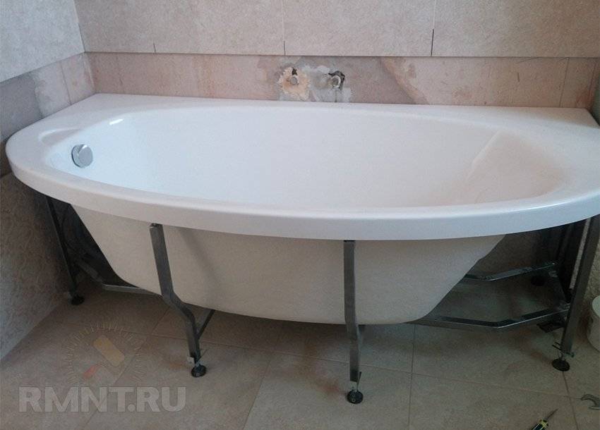 Перед отделкой зафиксируйте ножки ванны к полу дюбелями. Полы в ванной гладкие и иногда мокрые — человек может поскользнуться и сильно задеть ванну, а то и вовсе упасть на неё. Она должна выдержать такой удар.