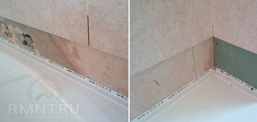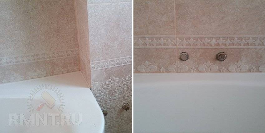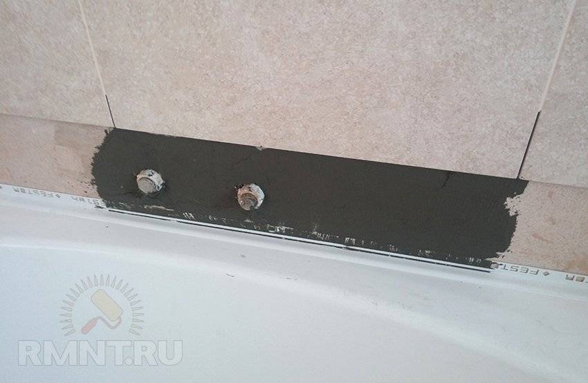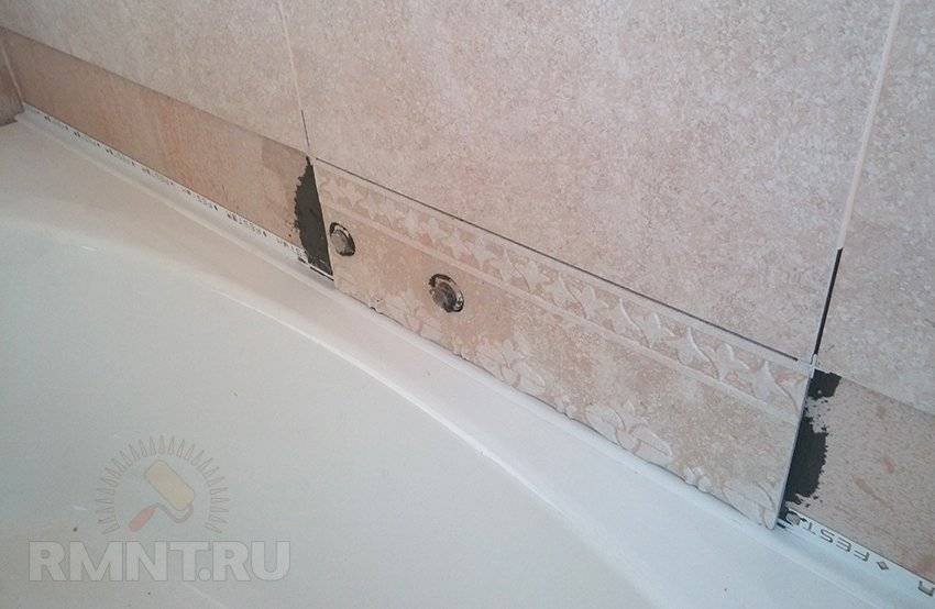 Подрезку делать аккуратно, т. к. не будет возможности спрятать огрехи — резаная кромка находится буквально на уровне глаз. После затирки, тщательно подобранной под тон плитки и ванны, примыкание совершенно сливается с фоном стены и акрила.