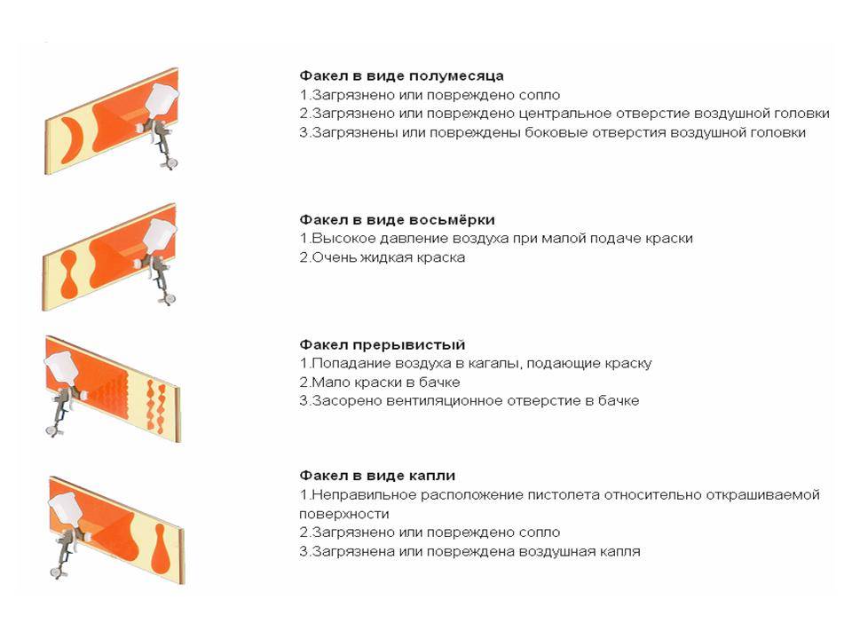 Факел работает с прерыванием. Это указывает на повреждение конуса сопла, слабую затяжку окрасочной головки, износ прокладки или повреждение. Вы можете: затянуть головку или заменить ее, а также заменить иглу или прокладку.